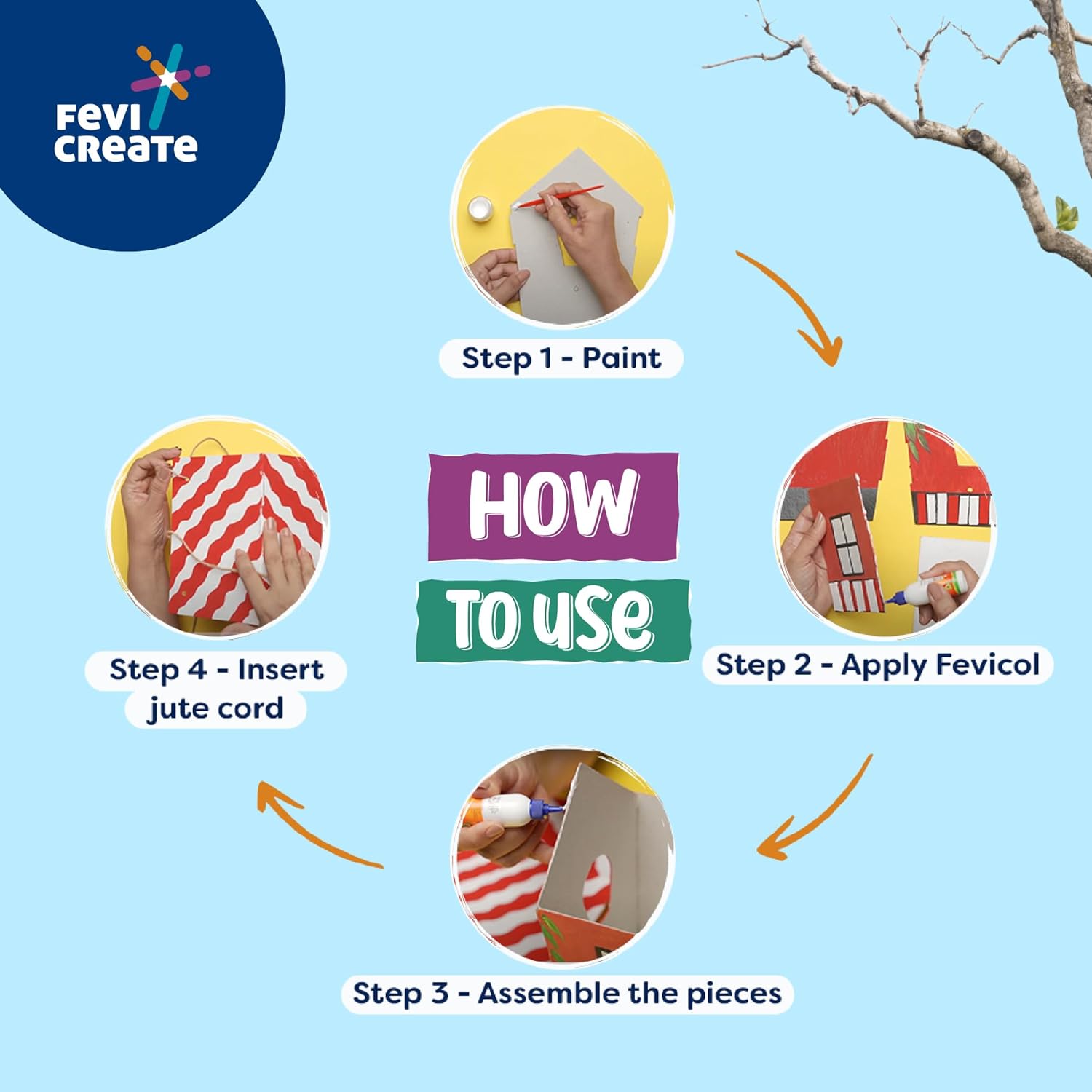 - It contains Fevicol MR, Rangeela Tempera colours, mount board cutouts, popsicle sticks, white acrylic colour, paint brush, an instruction manual and a rope