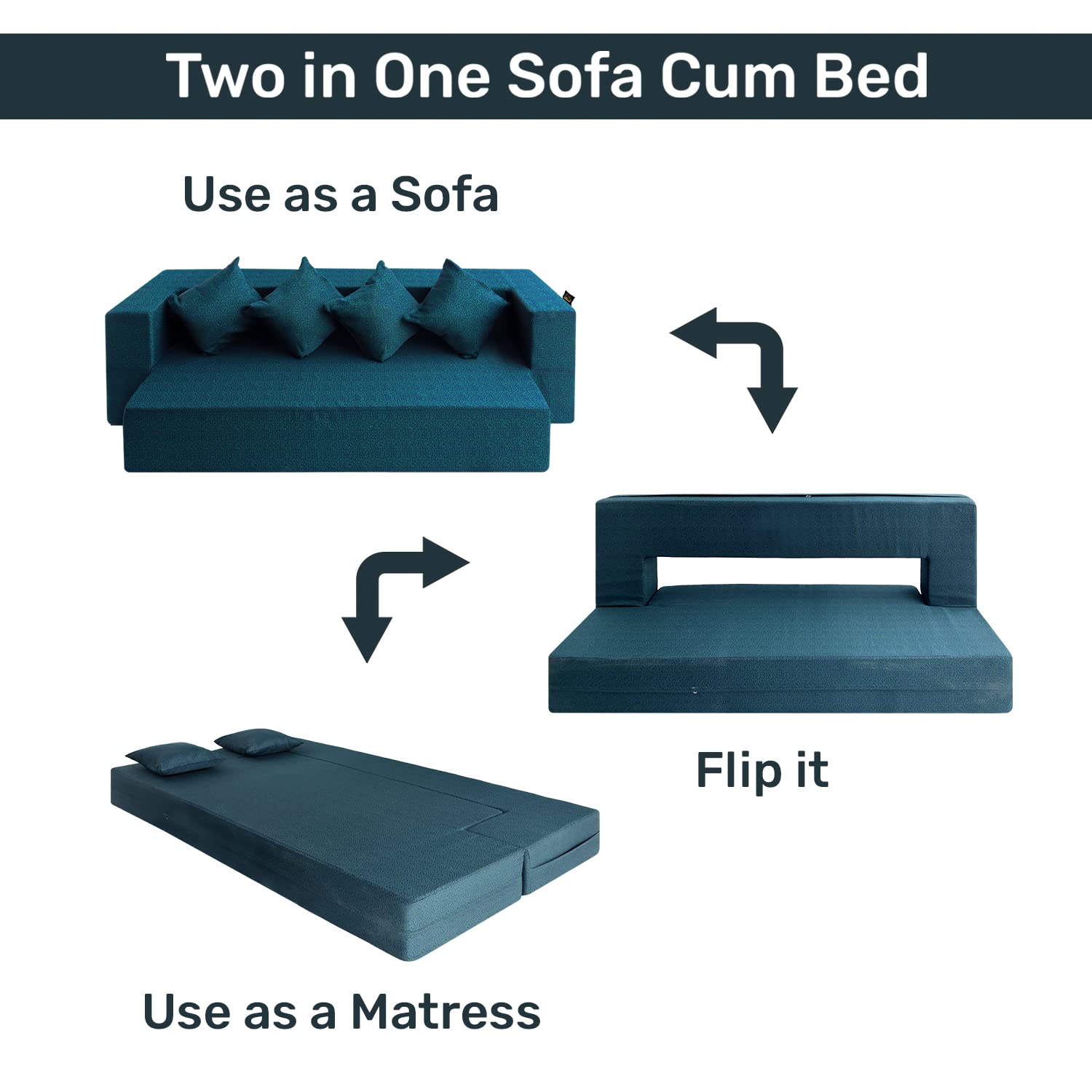 - PACKAGE CONTENT: 1 sofa bed + 4 Cushions | ASSEMBLY: already assembled, just flatten it to use it as a mattress and flip it to convert into a sofa.
